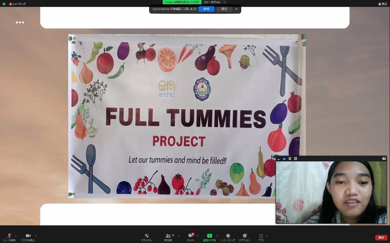 ジャネル・マカライサンがプログラムの流れを紹介し、コーディネーターのパメラ・モロン先生がさらに詳しく説明をしてくれました。その後、今回の給食プログラムを行いました。