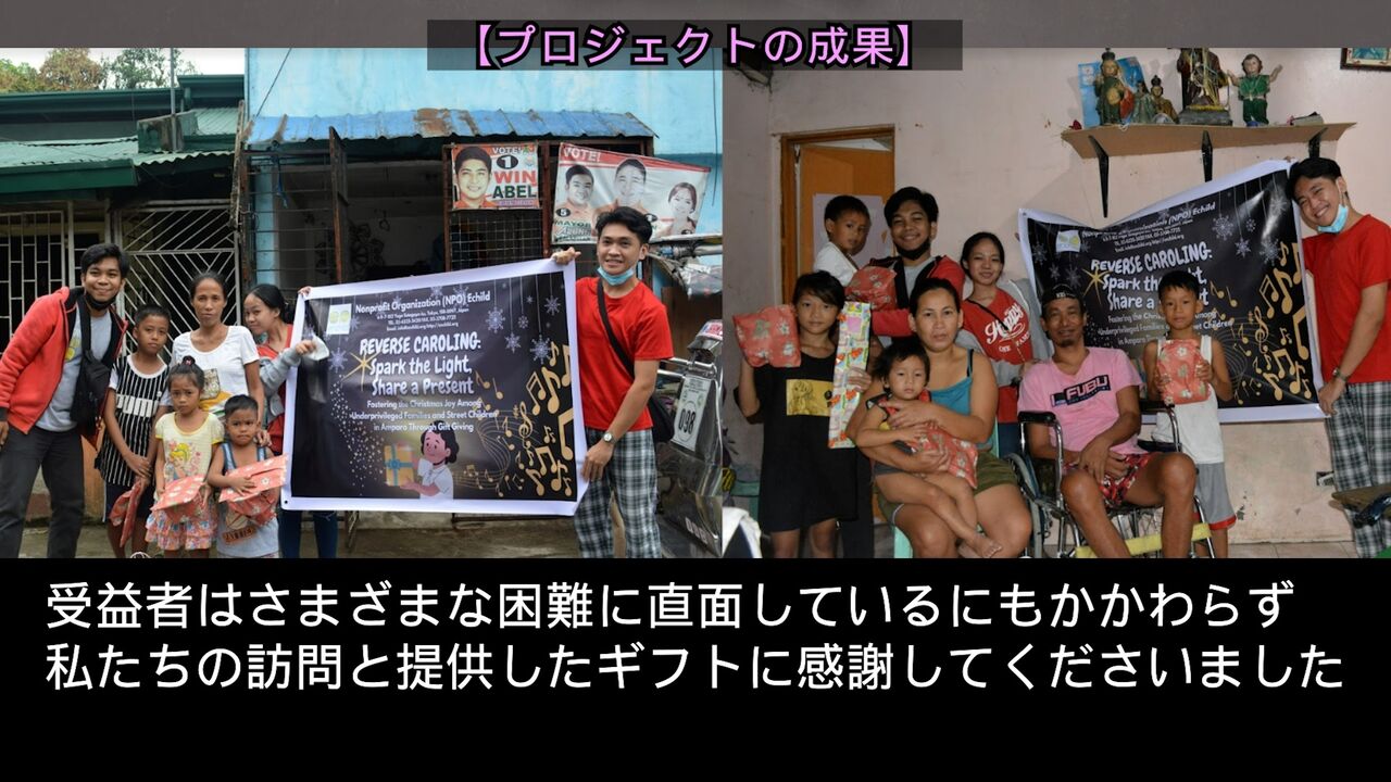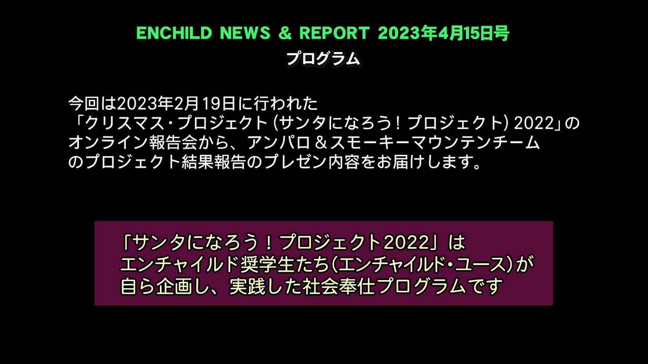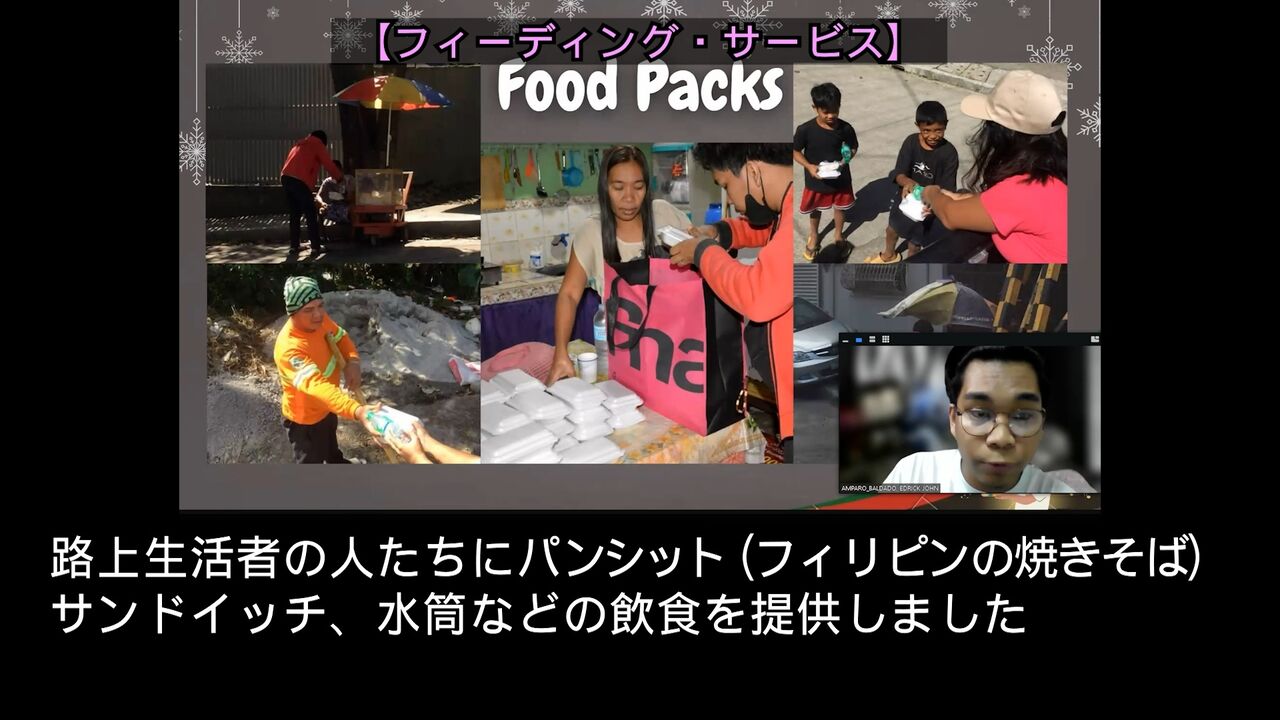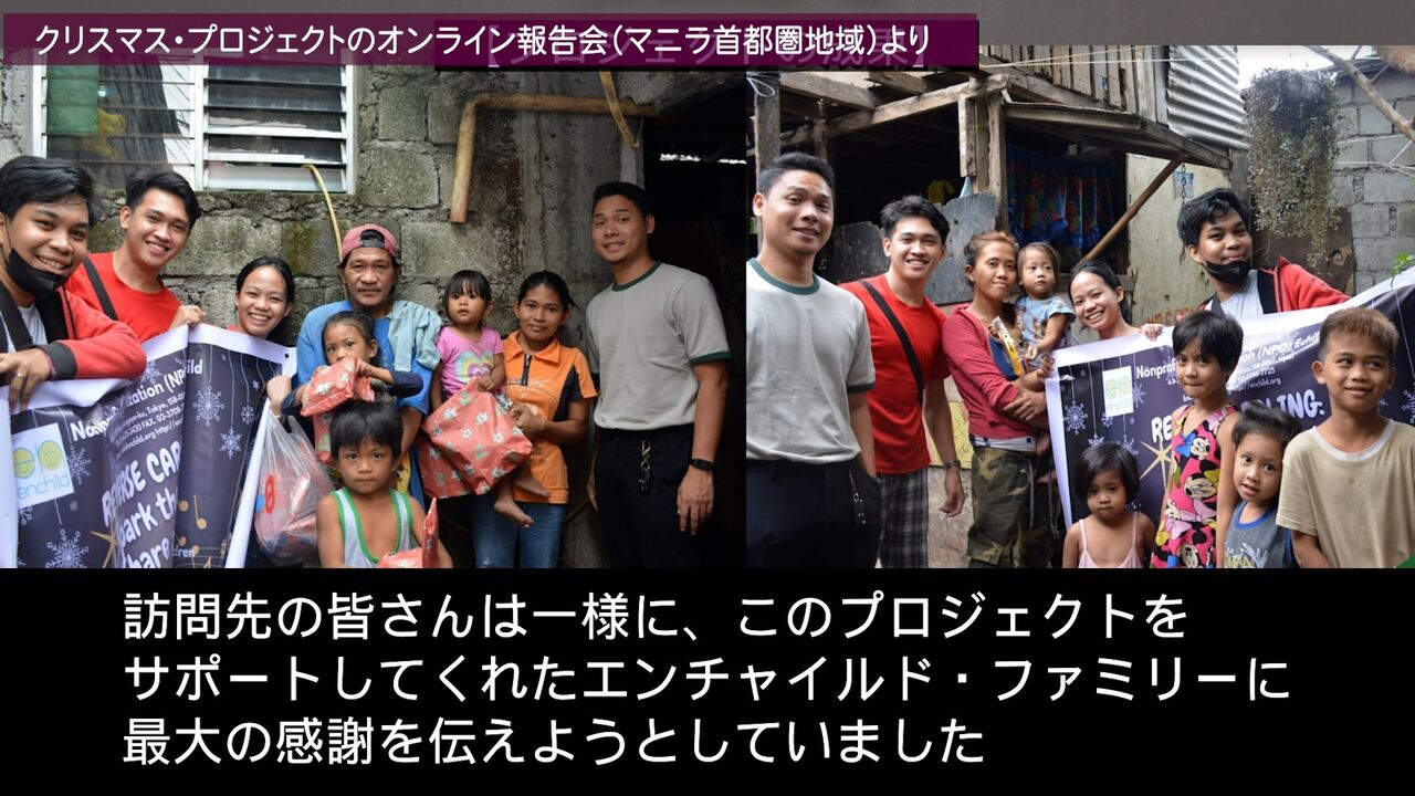 エンチャイルド奨学生による「クリスマス・プロジェクト(サンタになろう!プロジェクト2022)」の結果報告のプレゼン動画につきましては、同動画リポート2月25日号でバランガイ・ロサンゼルスのチームの報告を、3月15日号でバランガイ・マウグのチーム、バランガイ・アンバゴ&パガッパタンのチームの報告を、3月25日号ではマルセロ・H・デル・ピラーのチーム、MLQのチームの報告を紹介しました。こちらもぜひご視聴ください。
