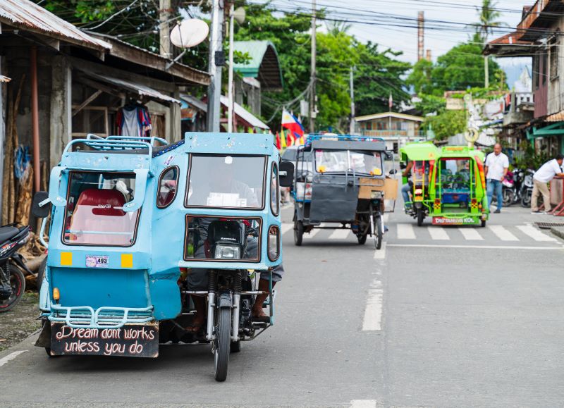 フィリピンでは、「トライシクル」と呼ばれる三輪タクシーが大量に走っていて、庶民の足として利用されています。定員は運転手を含め4~7人程度です。100 cc程度の小型オートバイを改造した三輪自動車や、屋根付のサイドカーが利用されているほか、自転車に側車を取り付けたトライシクルもあります。(参照:ウィキペディア)