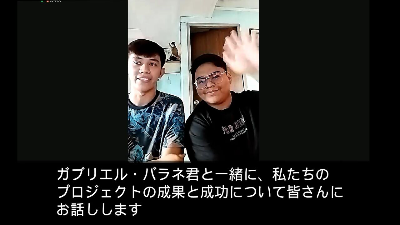 皆さん、こんにちは。私はマニラ市トンド地区バルットのエンチャイルド奨学生、ジョン・ウェンデル・アンブロシオです。ガブリエル・バラネ君と一緒に、私たちのプロジェクトの成果について皆さんに報告します。